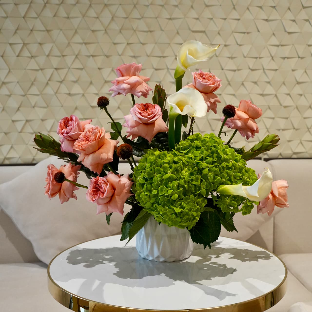 Elevate any space with this exquisite floral arrangement. Featuring delicate peach roses, elegant white calla lilies, and lush green hydrangeas, this arrangement creates a harmonious blend of colors and textures. Perfect as a sophisticated gift or to adorn your home or office with a touch of enchanting nature.