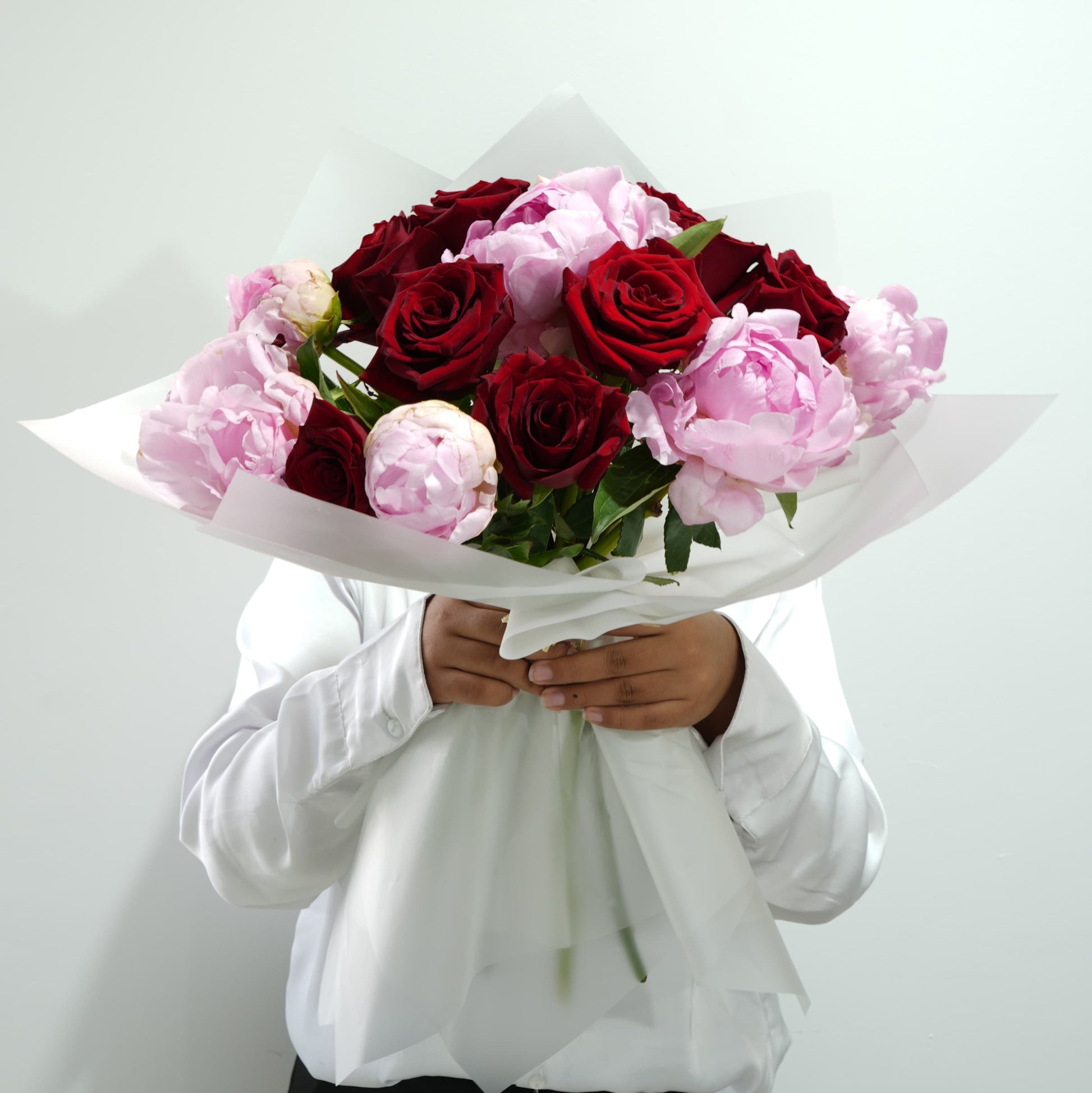 مزيجٌ رائعٌ من الشغف والأناقة - هذه الباقة تضمّ عشر ورود حمراء مخملية مع عشر زهور فاونيا وردية زاهية، جميعها مغلفةٌ بورق أبيض ناصع. مزيجٌ رائعٌ من الرومانسية العميقة والأنوثة الناعمة يجعلها الهدية المثالية لأعياد الزواج، أو المناسبات الرومانسية، أو الاحتفالات الفاخرة.