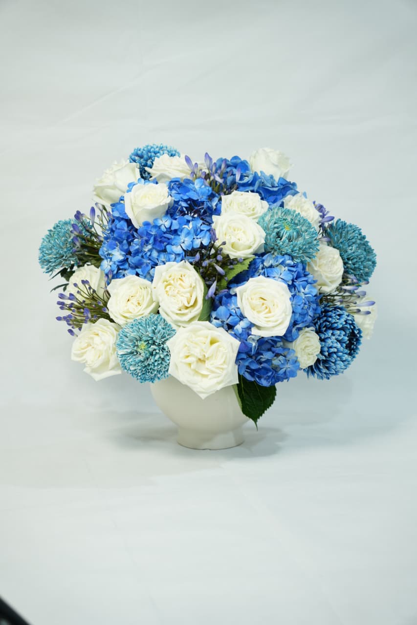 A luxurious arrangement that combines the elegance of hydrangeas with the timeless beauty of white roses, complemented by touches of blue flowers to create a sophisticated and opulent look.
