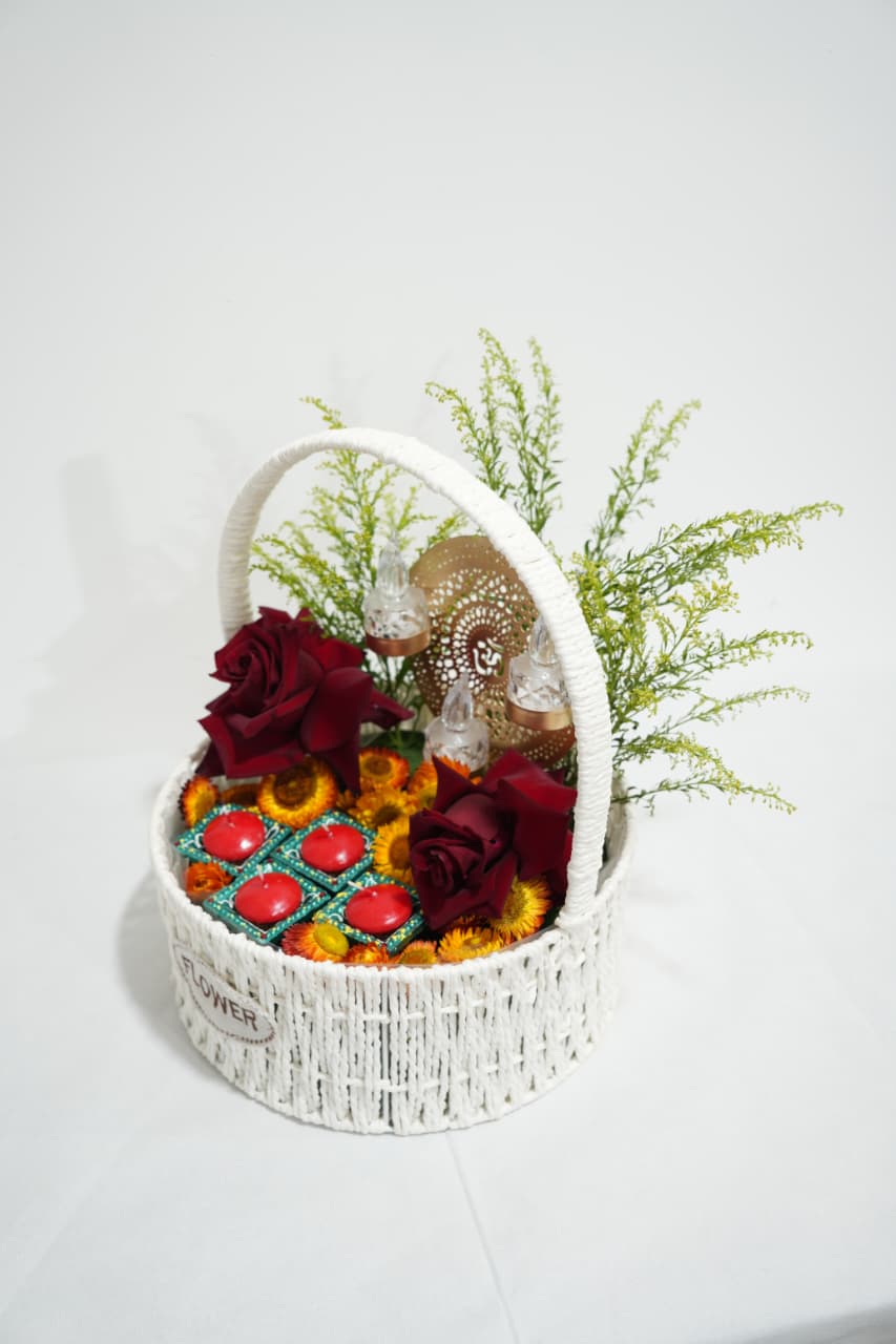 A beautiful Diwali gift basket, featuring a collection of fragrant candles and vibrant flowers, designed to illuminate the festive season.