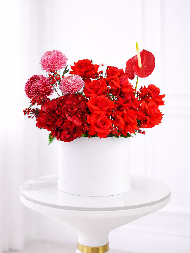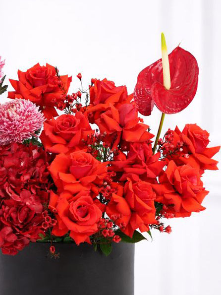 A luxurious arrangement featuring vibrant red roses in a sleek black box. This bold and elegant display is a true statement piece, perfect for expressing deep passion and admiration on any special occasion.